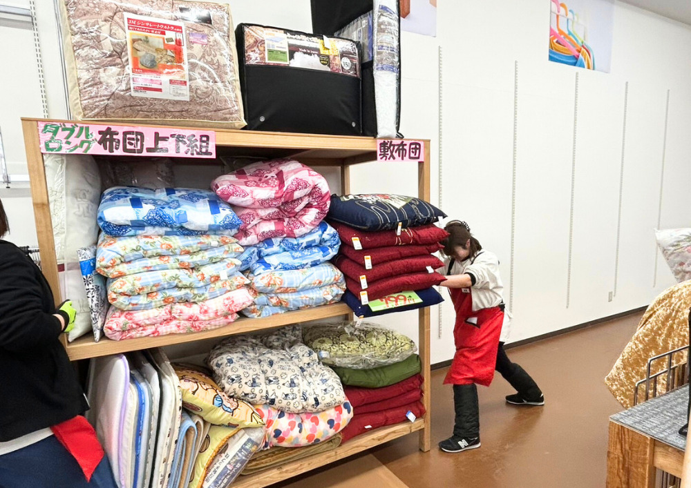 寝具コーナーでは、お布団を並べているズッシリとした木の什器もスタッフの手で移動させます