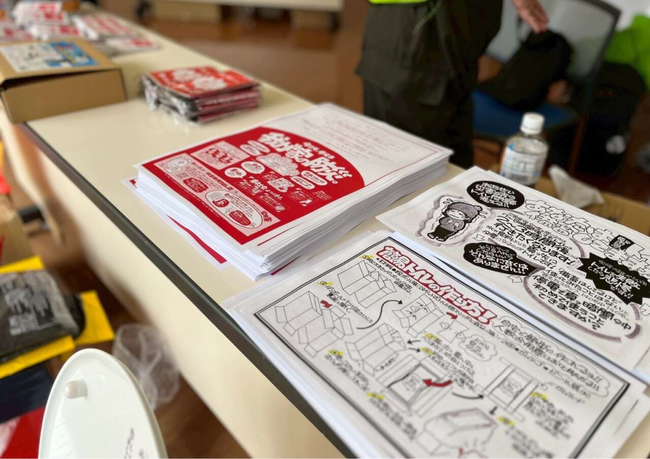 防災パンフレット、そして簡易トイレダンボールの作り方を載せたフライヤーなどをそれぞれブースに置かせていただきました