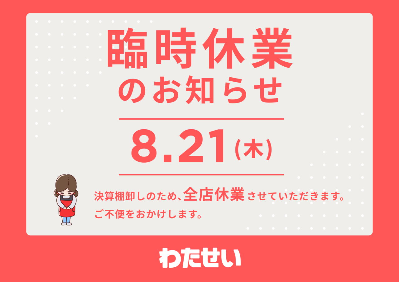 8/21(木) 決算棚卸しのため わたせい全店 休業させていただきます