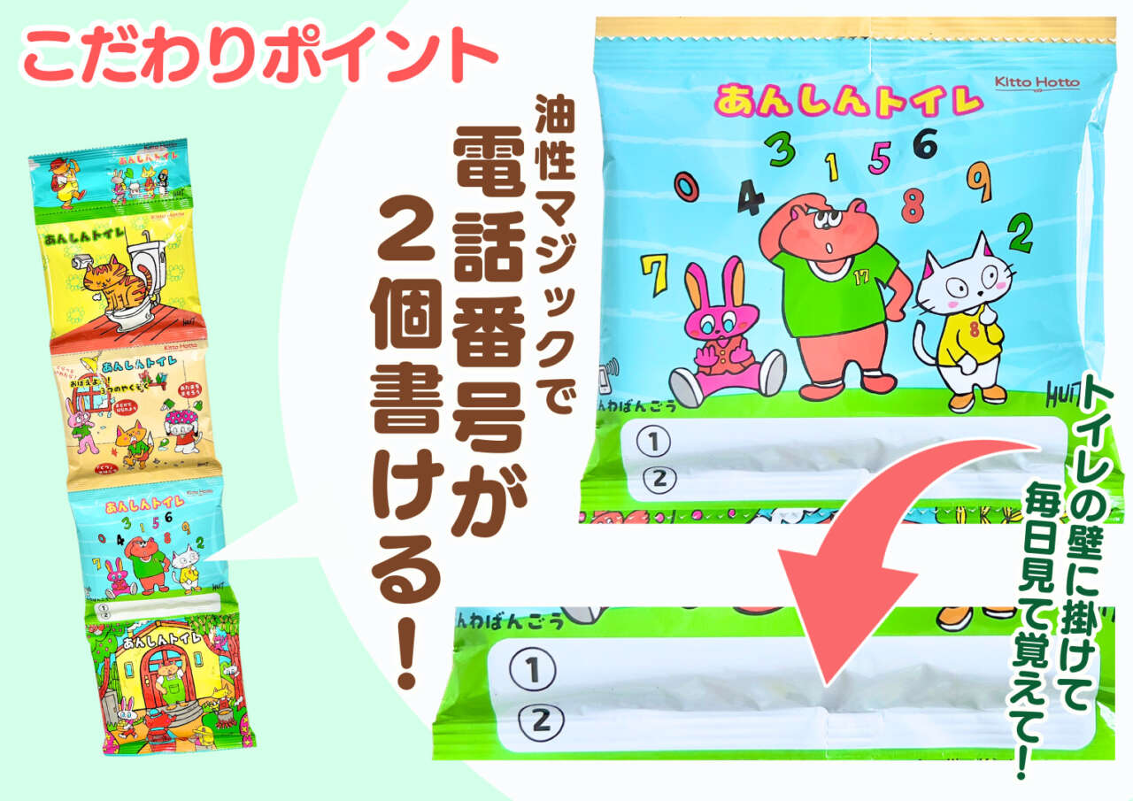 商品のパッケージには、電話番号や家族で集まる場所が書き込めるようになっているので、トイレの壁に貼って、毎日目に触れる場所に!